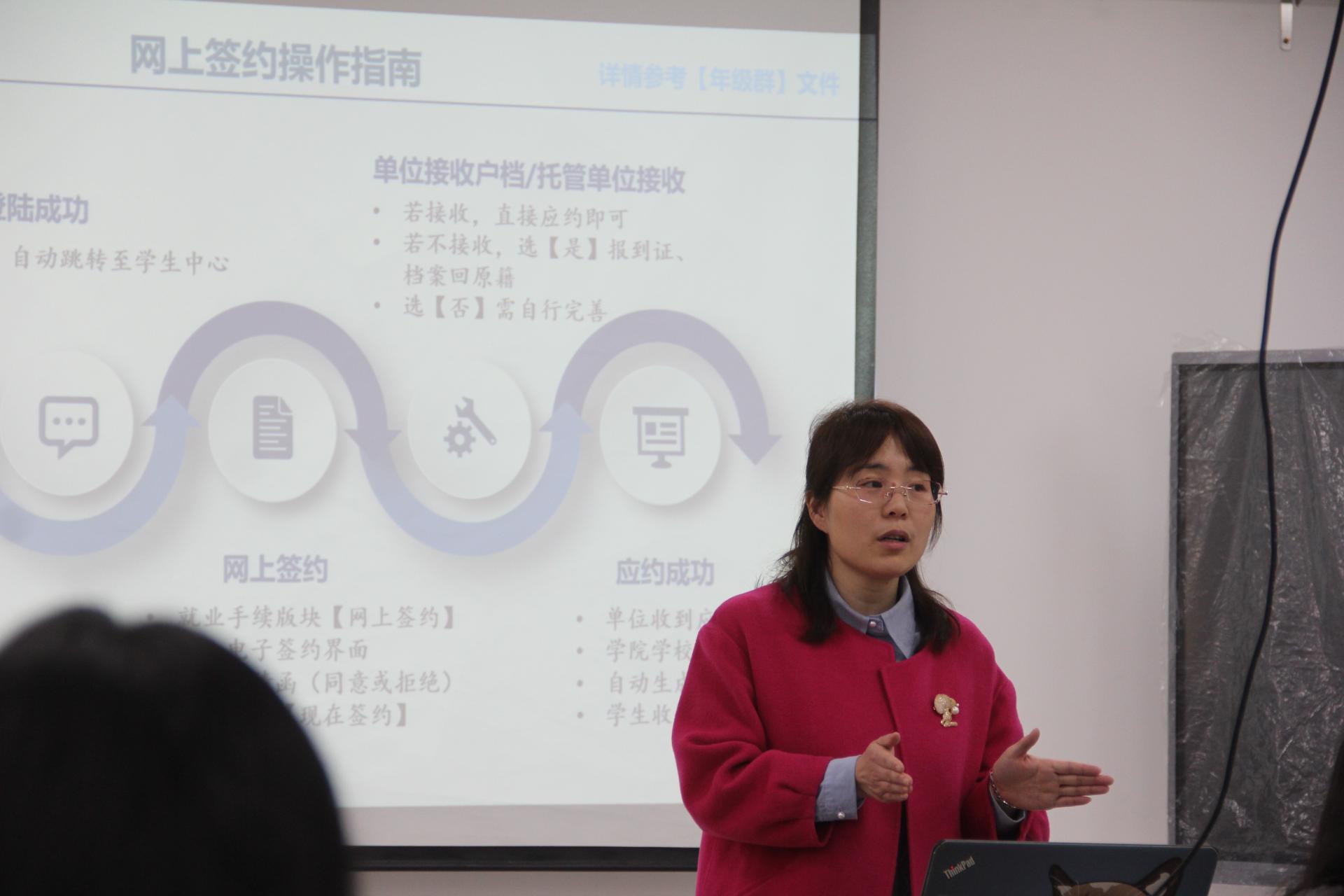 推进会上,王丽娟副书记结合数据图向同学们展示了2021届毕业生目前的升学率和就业率,以最直观的形式让大家了解身边同学的就业情况。随后,从考研二战、考公考编、有意向未签约、无意向待就业四类情况进行分析并进行分类指导。全面分析考研二战的利与弊,提醒准备二战的同学正确定位,慎重考虑;着重介绍国家“西部计划”“苏北计划”、参军入伍等政策,为考公考编员工拓宽就业思路;归纳分析部分校招企业的相关信息,促进未签约员工积极行动,把握好就业机会。