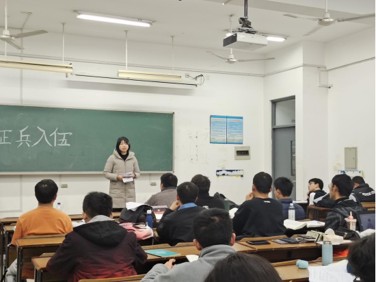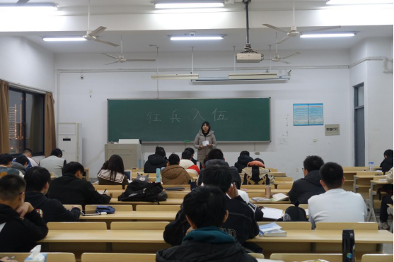 绪老师对登记入伍的基本流程进行解读,对报名阶段、材料提交、体检政审等方面做了详细说明。并宣传了复学、免修、考研加分、转专业和资助等五个方面优惠政策。她鼓励大家做有理想、有抱负、有担当的青年老员工,把个人理想抱负融入强军梦、中国梦中,积极响应党和政府的征兵号召,踊跃报名应征。