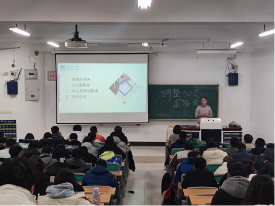 期末考试即将来临之际,为帮助同学们增强自我调适能力,12月30日下午,公司在厚学楼300开展“调整心态,‘赢’接考试”主题心理健康讲座。校心理健康教育指导中心主任朱巍巍老师主讲,公司心理辅导员绪慧敏老师及全体2021级同学聆听了讲座。