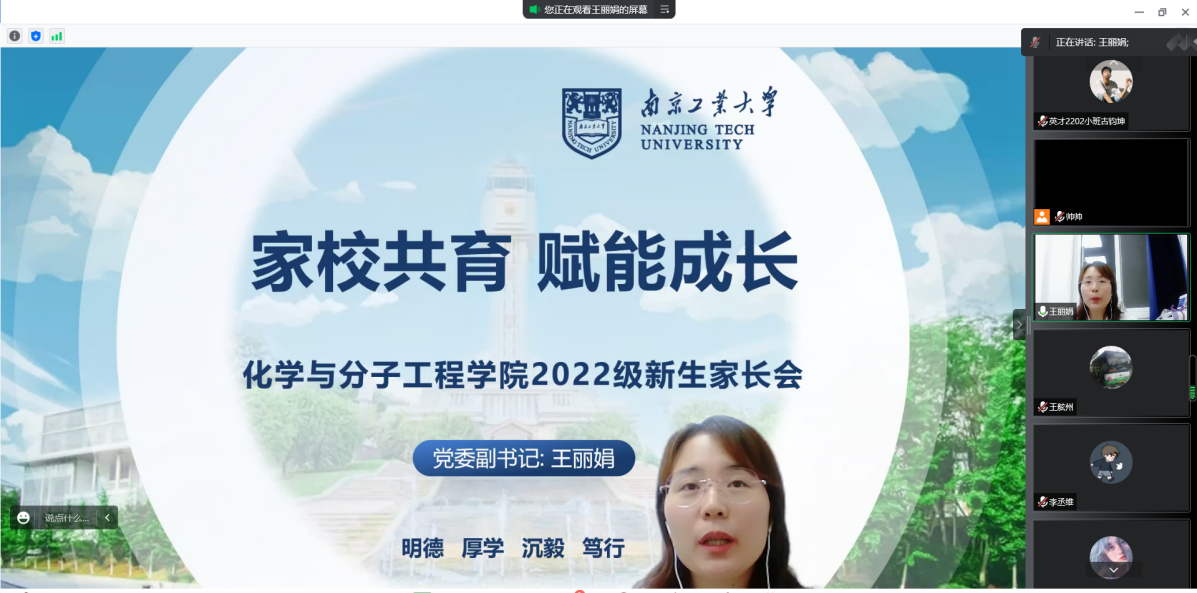 为加强家校联系,帮助新生家长更深入地了解孩子未来在公司的学习生活,9月1日晚,公司举行了线上2022级新生年级大会暨新生家长见面会。公司党委副书记王丽娟、22级辅导员吴帅帅、22级新生及家长参加了会议。会议由吴帅帅老师主持。