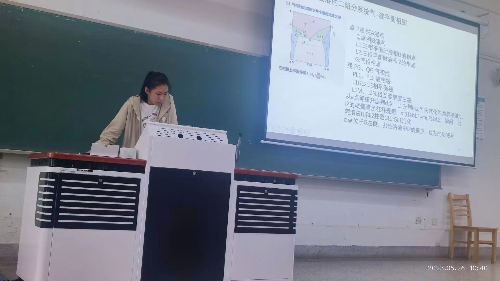 王晗朵为同学们梳理了《物理化学》本学期的知识点,解析了相平衡、电化学、化学反应动力学等一些重点难点,并带着同学们演算例题,加深理解。最后,她分享了自己学习的经验和体会,为同学们未来学习《物理化学》提供了新的思路和方法,同学们受益匪浅。
