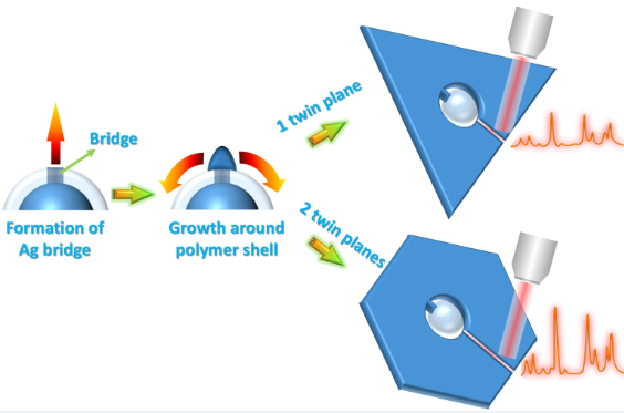 近日,公司冯宇华教授和陈虹宇教授课题组通过种子介导生长法得到了具有开放型的超窄线型间隙(长约90nm,宽约2nm)的六角形银纳米片结构。该法以聚苯乙烯-聚丙烯酸(PSPAA)双嵌段聚合物包覆银纳米粒子的核-壳型纳米颗粒为种子,银纳米片的生长从聚合物壳层内银种子表面的一点开始,沿聚合物表面向两侧延伸,相遇时不能融合,形成开放的超窄超长的直线型间隙。这种纳米片结构在SERS检测中显示了超高灵敏度,对2-萘硫醇的检测限达到10-9 M。