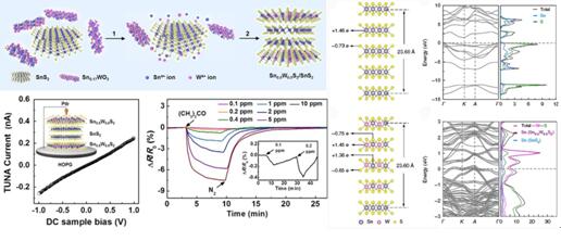 近日,太阳成集团tyc海外人才缓冲基地(先进材料研究院)黄维院士和黄晓教授课题组与太阳成集团tyc王强副教授课题组合作,首次通过液相法,以n型半导体1T-SnS2纳米片为模板,通过晶相和成分调控在其上下表面外延生长含有83%类1T结构的Sn0.5W0.5S2纳米片后成功制备了Sn0.5W0.5S2/SnS2垂直异质结构。理论计算表明合金化引起Sn0.5W0.5S2中Sn和W之间的电荷重新分布,使其具有金属性质。峰值力隧道电流显微镜测量进一步证实Sn0.5W0.5S2与SnS2的界面间欧姆接触的存在,这一结构显著降低了界面的接触电阻,提高了材料的光响应速度。同时,掺杂产物Sn0.5W0.5S2对丙酮分子的吸附能相较于本征SnS2提高了5倍,进而结合层状异质组分间的有效电荷传输,使得基于Sn0.5W0.5S2/SnS2异质结的丙酮气体传感器噪音仅为传统SnS2传感器的1/35,室温下100 ppb的响应值远优于众多同类传感器件。