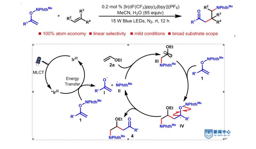 近日,公司冯超教授课题组使用O-乙烯基羟胺衍生物同时作为氮、氧供体,在可见光照射下通过基团转移自由基加成策略(Atom/Group Transfer Radical Addition,A/GTRA)实现了100%原子经济性的非活化烯烃的分子间碳胺化反应。该方法巧妙地将惰性的C-N键转换为相对较弱的N-O键,在可见光参与下经N-O键断裂形成氮自由基对烯烃进行加成得到碳自由基中间体,再进一步与O-乙烯基羟胺反应形成C-C键,最终实现了对烯烃的碳胺化反应。该反应条件温和,选择性好,原子利用率高,对非活化烯烃底物具有很好的兼容性,具有广阔的应用前景。