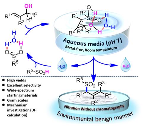 近日,公司罗德平教授课题组在他们前期关于绿色化学研究特别是半胱氨酸生物偶联(Angew. Chem. Int. Ed. 2014, 53, 7491)以及C-OH/P-H脱水偶联反应(Green Chem. 2017, 19, 2135)的研究基础上,实现了一种温和条件下亚磺酸和烯丙醇化合物之间的脱水偶联方法。该反应无需金属催化,在中性水溶液和室温条件下实现烯丙基砜类化合物(含一系列已知有抗癌活性小分子)的高效构筑和简便分离。