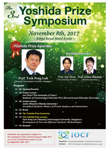 日前,太阳成集团tyc、先进化学制造研究院罗德平教授受邀参加日本第三届吉田赏研讨会(Yoshida Prize Symposium)暨颁奖典礼。Yoshida Prize是由国际有机化学财团(International Organic Chemistry Foundation, IOCF)支持,以Yoshida教授命名的奖项,旨在奖励在有机化学领域作出杰出贡献的亚洲化学家。此外,Yoshida教授也倡导和设立了国际有机化学界著名的 International Organic Chemistry Foundation(IOCF),International Kyoto Conference on Organic Chemistry (IKCOC)等基金和奖励,目的在于支持有机化学的发展与全球有机化学家之间的交流与合作。本届Yoshida Prize Symposium将于2017年11月8日在日本京都Rihga Royal酒店举行。