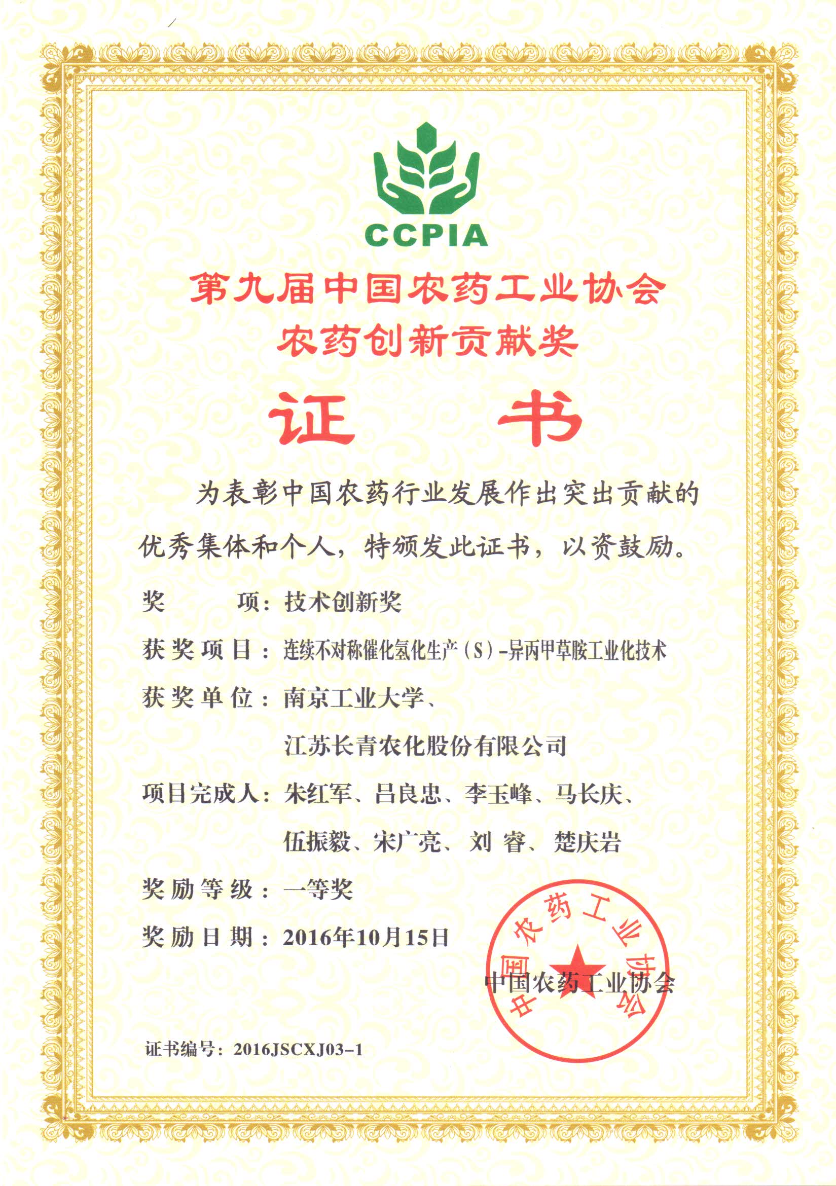 公司太阳成集团tyc副经理朱红军教授课题组和江苏长青农化股份有限公司共同完成的“连续不对称催化氢化生产(S)-异丙甲草胺工业化技术”项目,荣获第九届中国农药创新贡献奖(技术创新奖一等奖),该项目先后获得科技部“十二五”科技支撑计划和江苏省科技成果转化专项资金项目的立项资助,并通过科技部组织的专家委员会的验收与中国石油和化学工业协会组织的科技成果鉴定。