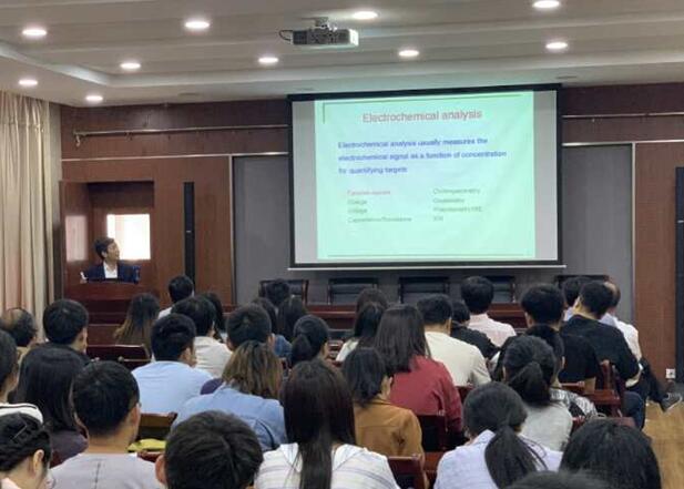夏教授首先介绍了其课题组的四个主要研究方向:等离基元增强与信号放大;仿生催化材料与能源;微纳流体分析;电化员工物传感器。报告从电化学分析及电子转移的概念入手,就电极界面性质调控蛋白质的取向及其界面电子转移速率、借鉴高催化活性生物酶的结构,仿生设计高效电催化剂以及表面等离子体共振如何加速电催化反应速率等三方面进行了讨论。报告还阐述了生物传感器件与生物分子电子器件的传感机理,使得师生对纳米材料催化特性的电化学分析领域有了更进一步的了解,开阔了大家的视野,为今后科研工作拓宽了思路。最后,夏教授与在场的师生进行了热烈的讨论与交流,详细地回答了现场老师和同学们关注的热点和难点问题。