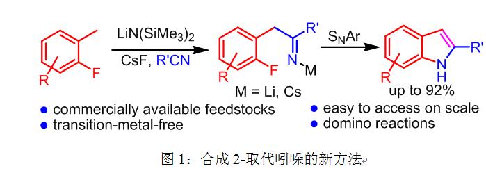此合成方法使用廉价易得的2-氟甲苯类化合物和腈类化合物,在LiHMDS和添加剂CsF的作用下,控温110℃反应12小时即可生成多样的吲哚类化合物(图1)。这种方法相较于传统合成2-取代吲哚的方法(如Fischer, Gassman, Hegedus, Madelung,及Reissert吲哚合成法),更为简单、经济、绿色环保,适用性更加广泛,便于规模化工业生产。
