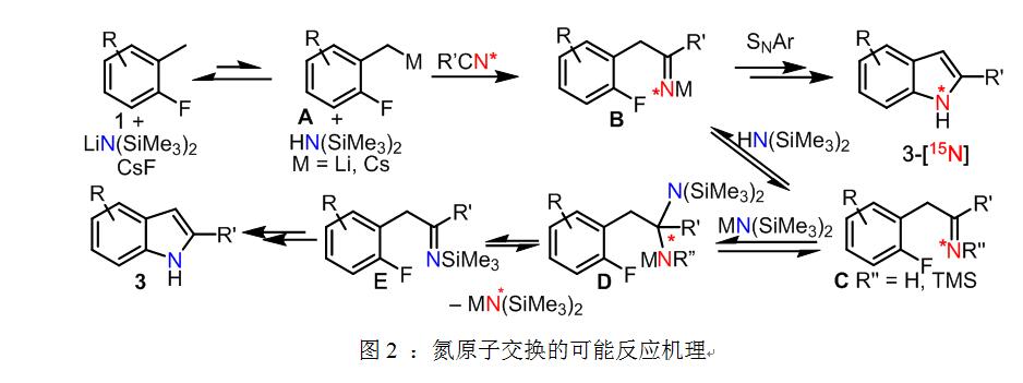 关于该方法的反应机理,毛建友教授和Patrick J. Walsh教授团队作了如下说明(如图2):在碱和铯盐添加剂的存在下,2-氟甲苯去质子化,并且是可逆的,得到碱金属化合物A,然后A进攻腈得到金属亚胺中间体B,中间体B可以质子化或甲硅烷基化,产生C。在强碱和铯盐的存在下,可逆地进行亚胺交换得到氮交换的另一中间体E。两个中间体B和E均可进一步进行分子内SNAr环化得到吲哚。