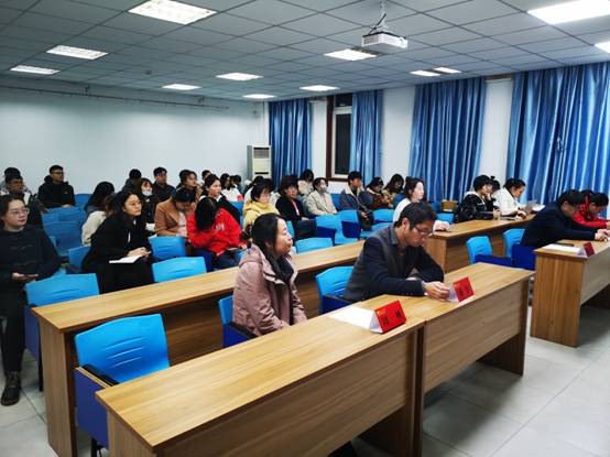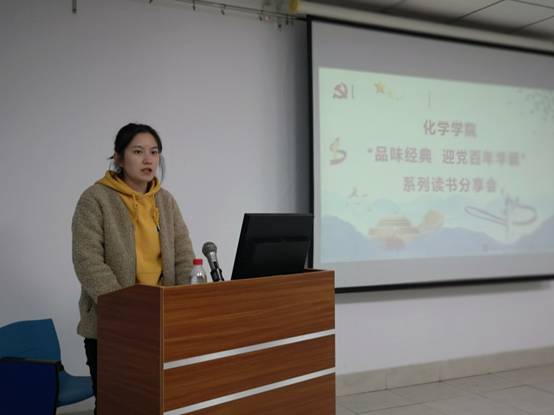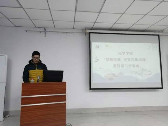 硕士研究生第一支部书记黄洁就支部党员研读情况做了汇报。张婷同学利用ppt展示和视频同大家分享了自己研读《如何做好党员》的心得体会。硕士研究生第四党支部书记刘泽尧结合自身求职经历分享了党员提高理论素质的重要性。