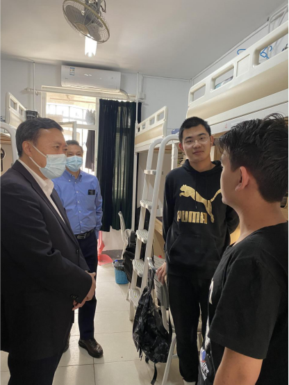 乔董事长一行来到公司值班办公室,与杨文忠经理、陈晓君副经理等值班老师亲切交谈,了解公司疫情防控期间值班情况、实验室运行状态,嘱咐大家要不折不扣落实公司各项防控举措。随后,乔董事长一行在公司领导、学办辅导员的陪同下来到西苑员工宿舍,就目前公司升级疫情防控管理后员工的线上学习、生活与员工深入交流。乔董事长在听取了同学们学习、生活、思想状况等情况汇报后,鼓励同学们正确认识高校疫情防控形势,及时调整疫情防控条件下学习生活策略,加强和公司老师的沟通,加强体育锻炼,积极做好个人防护。