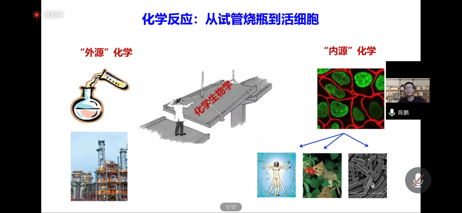 报告会上,陈鹏教授分享了其课题组近年来在推动生命研究的化学反应领域的重要进展,着重介绍了生物正交“偶联反应”构建神经元膜电位荧光探针、从活体细胞到活体动物内的“IEDDA”生物正交剪切反应、磷酸激酶的特异激活与机制、基于计算机辅助设计的蛋白质通用激活平台、基于生物正交反应的空间蛋白质组学技术以及基于生物正交光催化剂的亚细胞蛋白质组学技术等研究,并对临床医学驱动的化员工物学进行了前景展望。在互动环节,陈鹏教授与公司师生就生命过程中所涉及复杂多样的化学过程的不同类型展开了深入探讨。