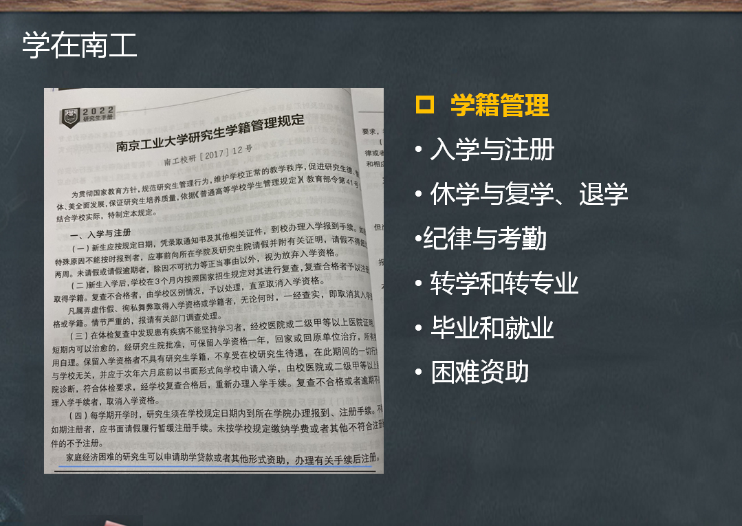 有温度的管理,能在潜移默化中促进研究生提升思想道德品质、养成良好行为习惯。研究生辅导员周一帆面向新同学开展了校纪校规教育,重点解读了学籍学分管理、请销假管理、资助及评奖评优等制度,对日常管理、科学防疫提出了具体要求。研究生教学秘书程钠结合学分管理、学籍管理、学位管理,深入解读了公司产品方案,介绍了研究生管理系统的使用方法。