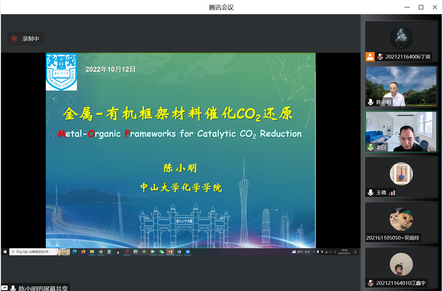 报告会上,陈小明院士与大家分享了其课题组近年来在MOFs光催化和电催化二氧化碳还原领域的重要进展,着重从活性位点微环境、电荷驱动自组装以及光敏与还原基元一体化三个方面与金属位点调控、多活性位点协同以及质子源的影响三个方面分别介绍了高效光催化和电催化MOFs的分子设计,并对MOFs光催化和电催化二氧化碳还原应用进行了展望。在互动环节,陈小明院士与公司师生就光催化和电催化二氧化碳还原MOFs的设计合成策略、机理研究困局以及机理研究人才培养方式等展开了深入探讨。