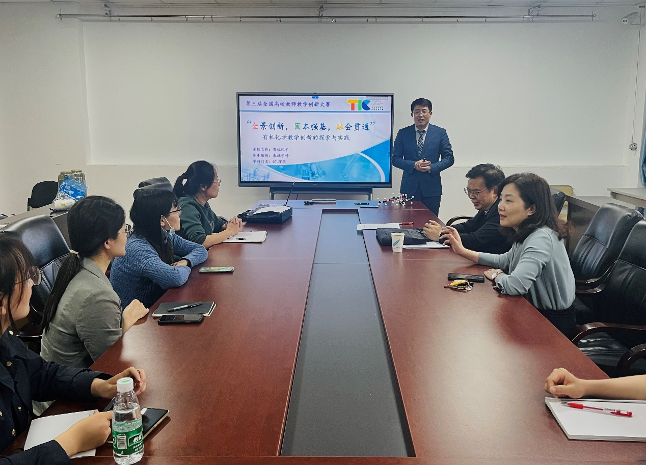 会上,江苏省教师教学创新大赛特等奖获得者赵恺老师进行了题为“全景创新 固本强基 融会贯通-有机化学教学改革创新的探索与实践”的创新设计汇报,分享了他在教学创新大赛中的备赛经验和心路历程。钟秦教授对汇报给予了高度肯定,同时提出汇报需进一步精炼内容,充分体现有机化学学科和课程建设丰硕成果的建议。随后,钟秦教授以课程思政创新为例,就如何凝练教学创新理念、提升课件设计等做了专题报告,其渊博的学识,深厚的教学积淀以及对教学创新的深刻理解令参会老师受益匪浅。