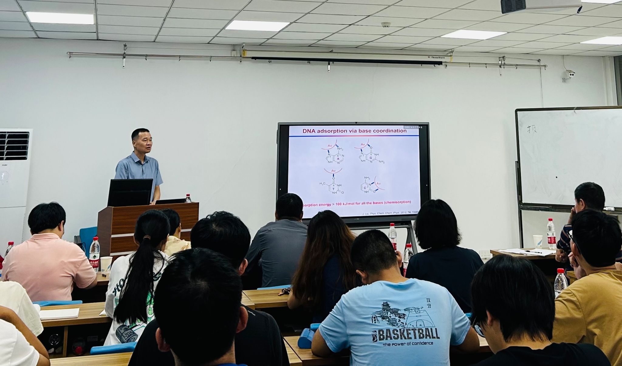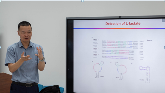报告会上,刘珏文教授从DNA的碱基与金属之间的作用力开始讲解,探索了十余种金属纳米颗粒与DNA不同碱基序列间的相互作用力,后立足于金纳米粒子与荧光化DNA分子间的强吸附性,重点介绍其课题组利用金纳米粒子吸附巯基DNA分子产生的荧光淬灭特性,取得了一系列研究成果,并阐述了该项研究在吸附乳酸等小分子方向的新进展。刘珏文教授还分享了其课题组创新型地引用冷冻条件,实现了金纳米粒子对DNA吸附量的新突破,在材料科学和分析生物学领域具有广泛应用前景。互动环节,刘教授针对荧光探点敏感度,空气微生物检测等方面的问题,为参与提问的老师和员工代表们做出了详细解答,大家受益匪浅,学术探讨氛围热烈。