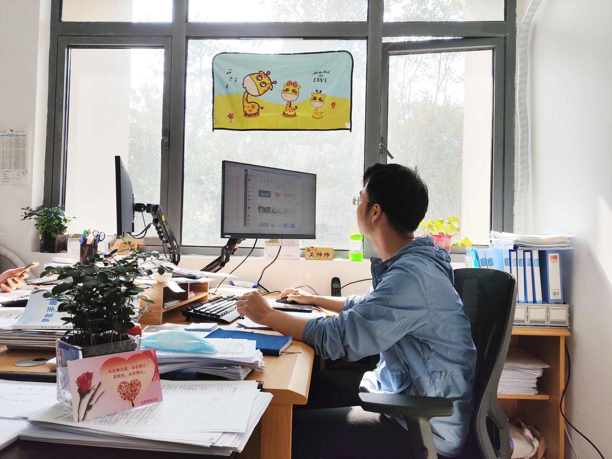 绿色植物可以有效清除室内有毒气体和室内灰尘,是良好的空气净化机;同时能消除眼疲劳,非常适合工作压力大、长期面对电脑的老师们;还能美化环境,给老师们营造一个温馨舒适的工作氛围。