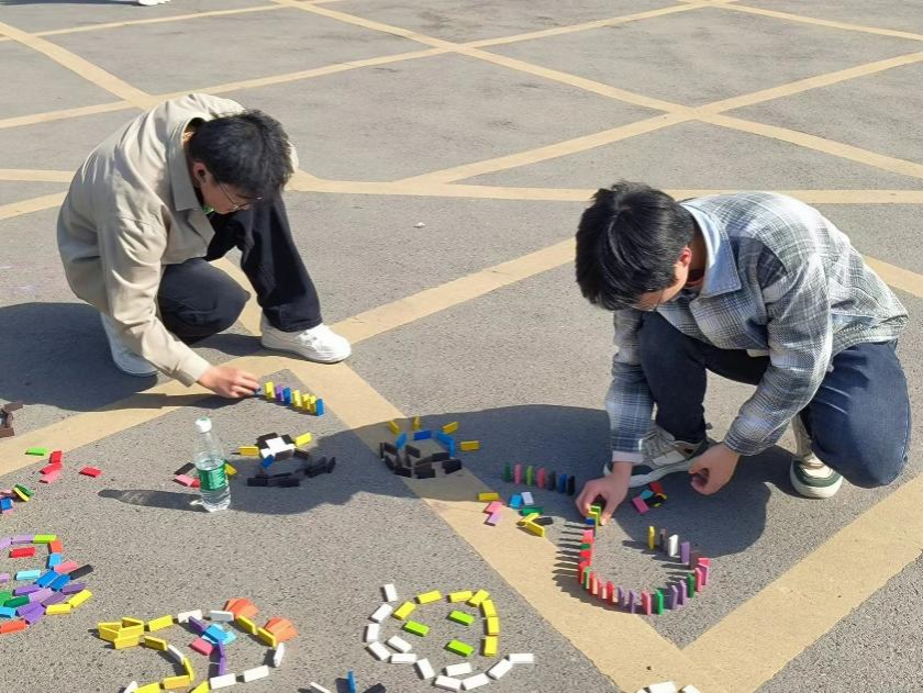 活动要求参与同学用多米诺骨牌摆出自己心仪的图案,它可以是一个数字或字母,也可以是一幅创作。沐浴着春日暖阳,同学们纷纷拾起手中的骨牌,与小伙伴集思广益,协调合作,在体验过程中反复演练试错,推倒重来,最终以小聚大,拼接出一连串五彩斑斓的艺术品。