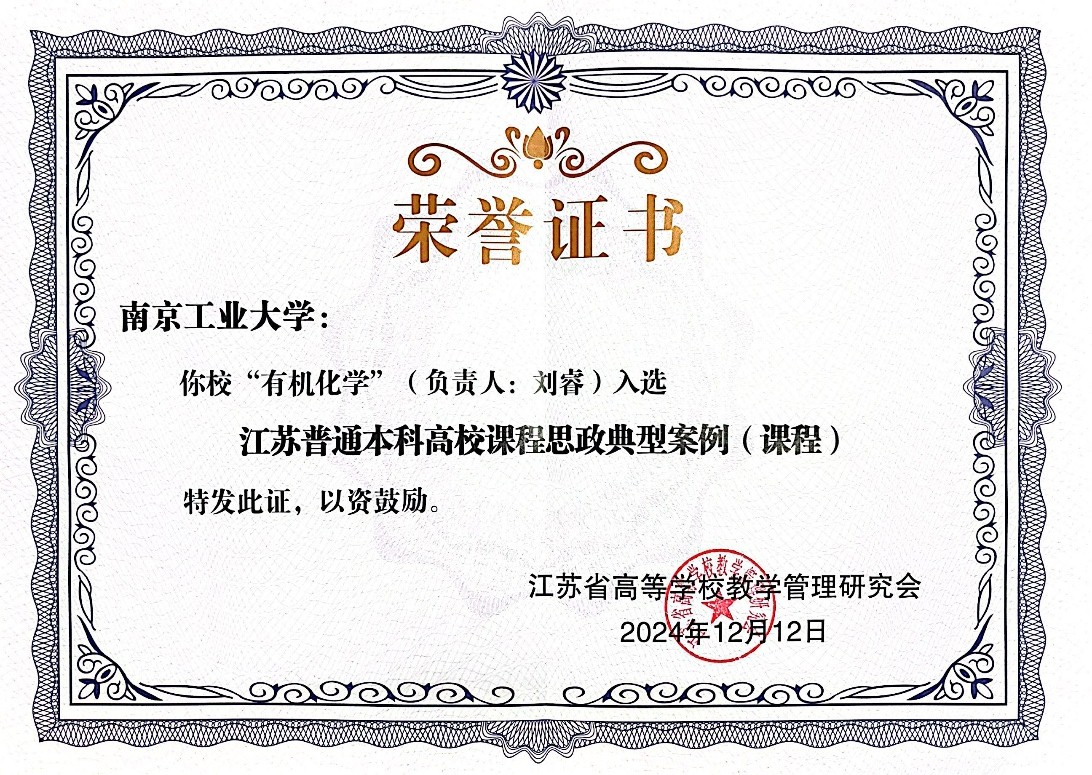 近日,江苏省高等公司教学管理研究会课程思政建设工作委员会公布了2024年江苏省普通本科高校课程思政典型案例入选名单。公司刘睿老师负责的《有机化学》课程案例入选江苏省普通高校课程思政典型案例(课程)。