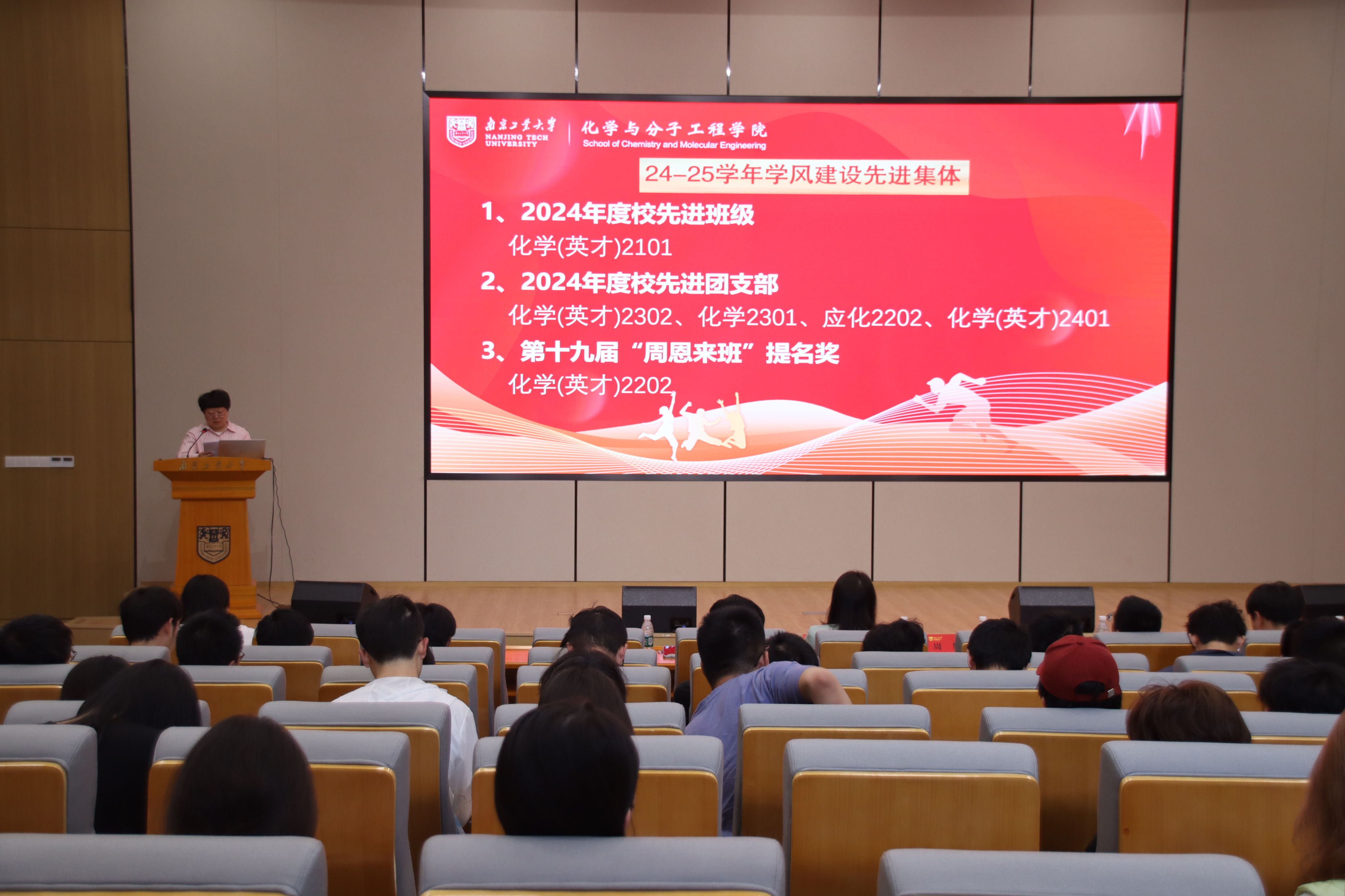 第四届江苏省节能减排大赛一等奖获得者程煜辉以“灵动之能折叠电池”为主题,生动展示了团队在折叠电池利用项目中的探索历程。先进个人代表化学(英才)2302的李金燦同学和先进班级代表化学英才2101班的郑雅雯同学分别发言,分享了他们在学风建设中的宝贵经验和心得。员工会代表蒙秋行同学宣读了学风建设倡议书,号召全体同学以实际行动践行优良学风。最后,王丽娟副书记以“心中有爱,眼里有光”为主题,寄语全体员工以先进为标杆,在勤学中增长才干、在修德中锤炼品格,共同构筑具有太阳成集团tyc特色的学风氛围。