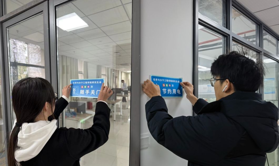 倡导节水节电,增强节能意识。研究生会和研究生第三党支部在各实验室、楼道等人员活动密集区域,张贴“节约用电”“节约用水”等宣传标语。同时利用互联网的力量,在班级群等渠道发布节约用电提醒,营造节能降碳、绿色环保的氛围。