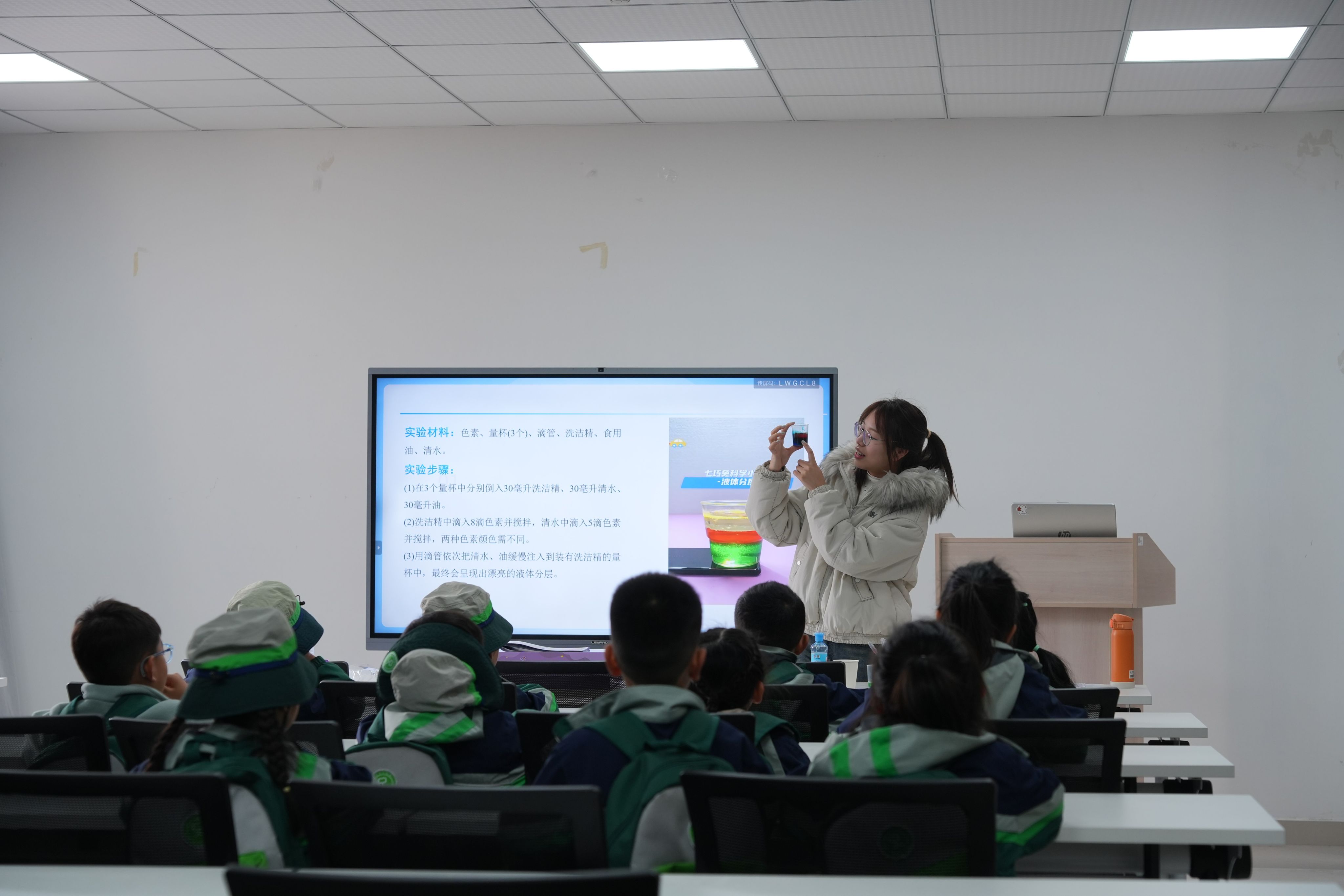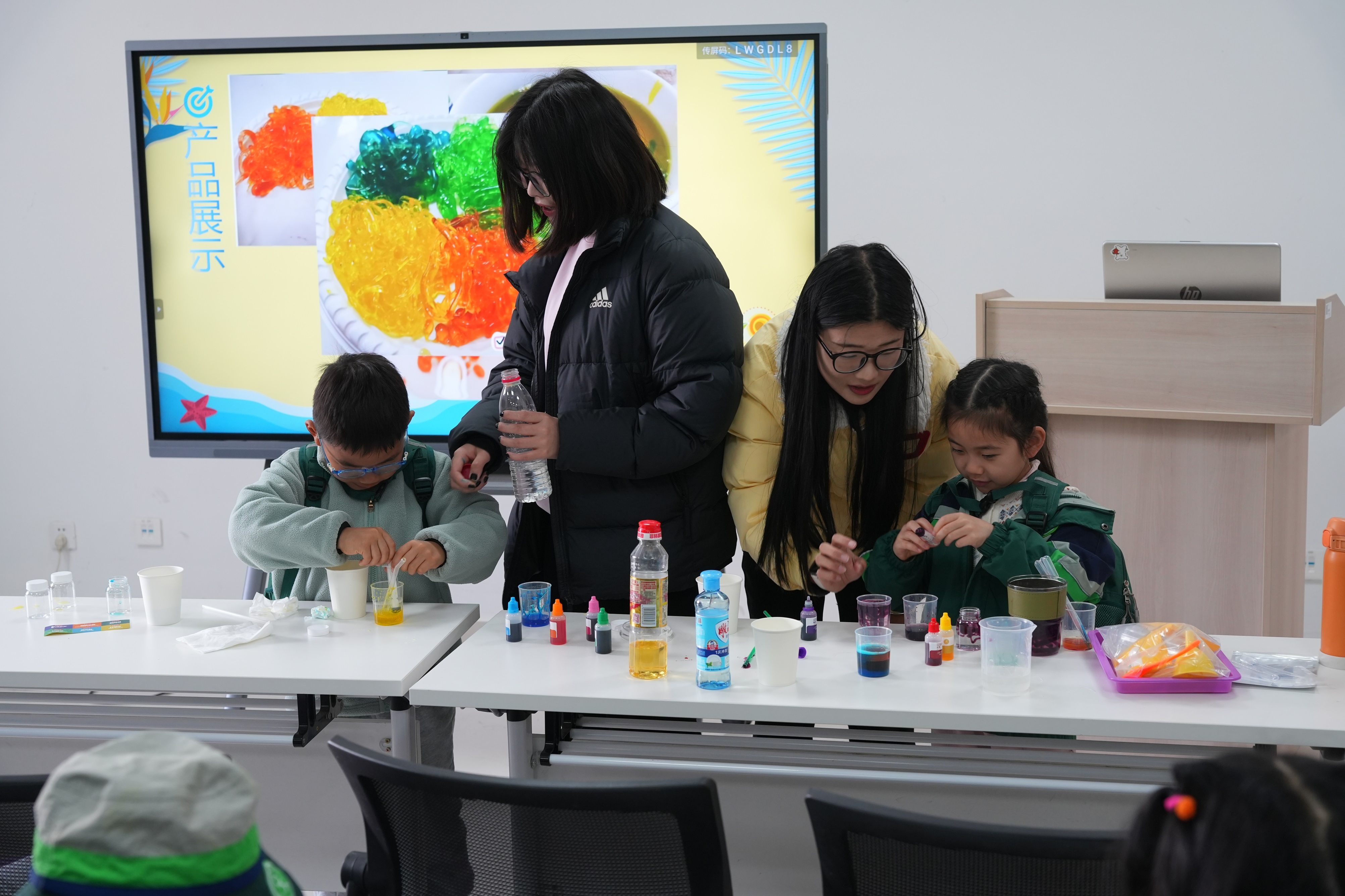 研究生会的同学分别为小朋友们演示了“彩虹塔”里的密度密码、“魔法粉末”变出透明“海蜇”和疏水材料上演“水滴登山记”三个科普实验。活动现场,研究生将表面张力、高分子聚合等概念转化为“液体大力士”“材料变形记”等故事,用充满童趣的语言解释实验中蕴含的化学原理,孩子们争相提问:“这个‘海蜇’能做成玩具吗?”“彩虹塔能变成饮料吗?”充满想象力的互动让A408实验室秒变科学游乐园。