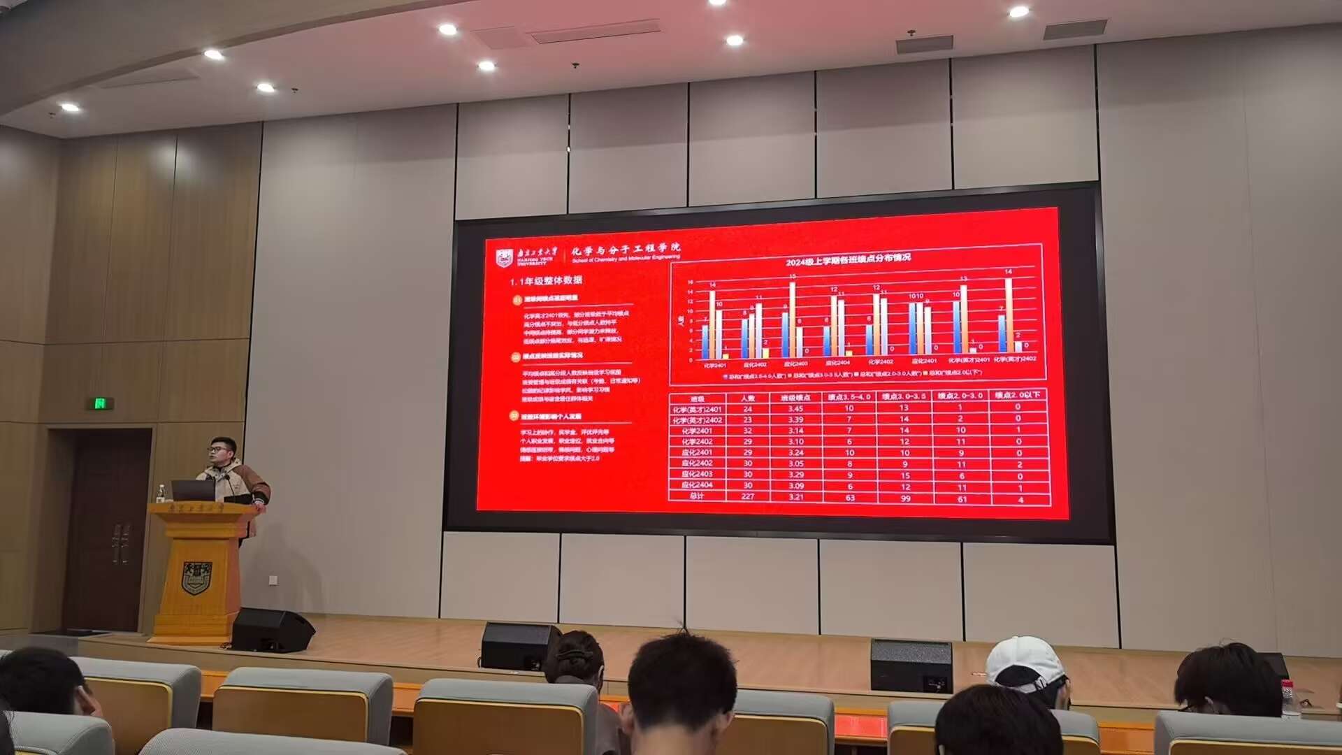 方进老师首先回顾了上学期的整体情况,通过详实的数据剖析了年级及各班的平均绩点、优秀率和各科目的考试情况,引导大家反思学习方法,为本学期的提升做好准备。同时,也对四级考试情况进行了分析,鼓励同学们提前规划英语学习,积极备考。