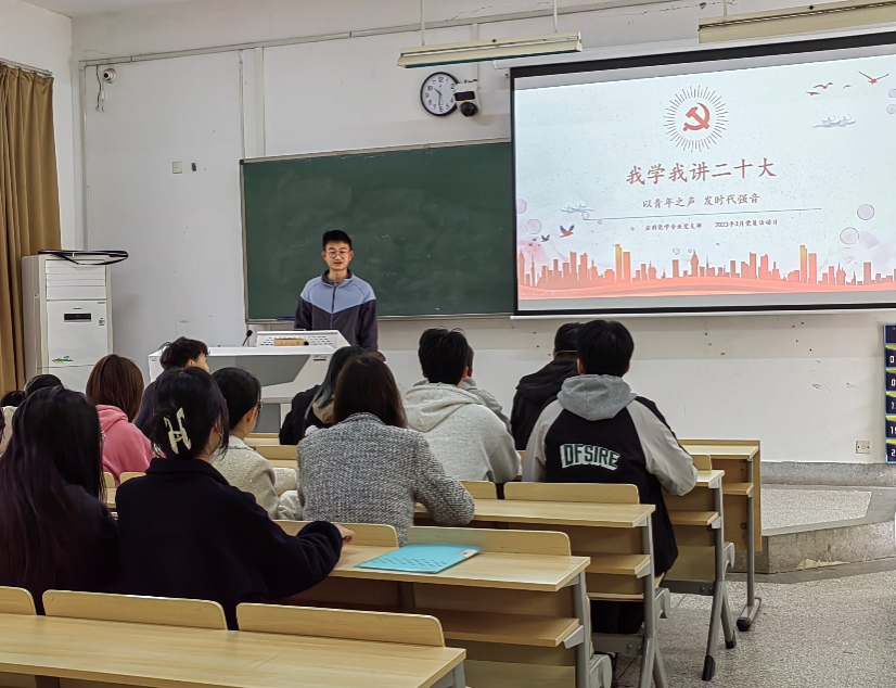 为深入学习贯彻党的二十大精神,弘扬伟大建党精神,不断提升党员的党性意识,充分发挥党员的先锋模范作用,3月16日上午10点半,应用化学党支部在笃学B207开展“我学我讲二十大”党员活动日主题学习活动。活动由应用化学专业党支部副书记丁威主持,19级全体党员参加活动。