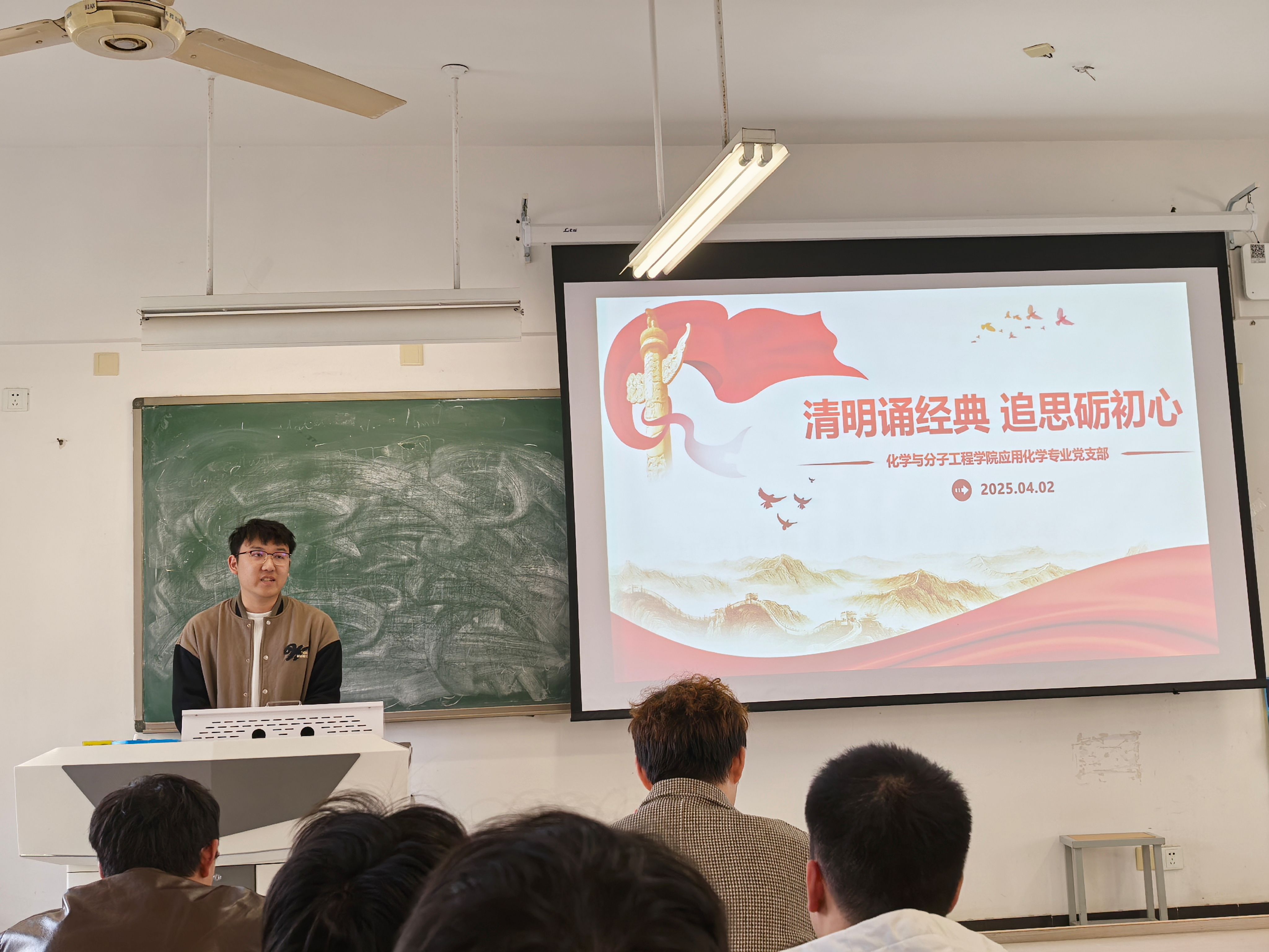 为深切缅怀革命先烈,传承红色精神血脉,4月2日下午16:30,应用化学专业党支部在厚学楼405教室开展“品味经典”学习分享会,应用化学专业党支部副书记李铮凯主持活动,支部全体党员参加,分享会以“观影+诵读+研讨”的形式,在清明时节共缅先烈、共话初心。