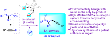 Abstract: A highly efficient Pd/Ca catalytic system for the directly dehydrative cross-coupling of allylic alcohols with terminal alkynes was developed. This calcium salt cocatalyst facilitates the oxidative addition of the palladium catalyst (1 mol%) to the C-OH bond. Then, the in situ-generated hydroxide ion deprotonates the terminal alkynes to promote the formation of the allylalkynylpalladium intermediate, liberating water as the only byproduct. This proposed mechanism is also supported by DFT calculations. An anti-cancer agent was prepared from inexpensive starting materials on a 10-gram scale.