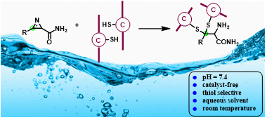 Abstract: 2H-Azirine-2-caboxamides have been designed to perform as a new type of bifunctional thiol linker under very mild reaction conditions. The cleavage of a C−N double bond of 2Hazirine furnishes an amino amide functional group in situ through a thiol addition and ring-opening process. It works with a broad scope of thiols and 2H-azirines in the absence of any catalysts at room temperature. Cysteine-containing peptides have also been demonstrated to work efficiently in a completely water solution.