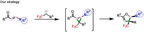 Abstract:A straightforward strategy for synthesis of highly functionalized trifluoromethyl 2H-furans is described. The copper catalyzed method relies on a cascade cyclic reaction between enaminones and N-tosylhydrazones. This method allows the synthesis of 2-amino-3-trifluoromethyl-substituted 2H-furan derivatives carrying a quaternary stereogenic center as single diastereomers. The proposed reaction mechanism involves an amino-cyclopropane intermediate formed in the cyclopropanation of enaminones. The developed method tolerates a broad spectrum of functionalities, and the obtained 2H-furan derivatives are useful synthetic intermediates for preparing other trifluoromethylsubstituted compounds.