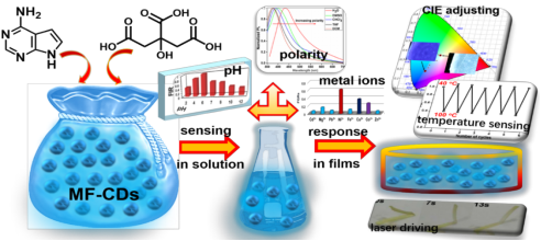 Abstract:Developing multi-functional materials is crucial to manufacture integrated devices and advanced instruments. However, the development of multi-functional properties is limited because most of the materials can only perform single-phase processing or detection. In this current study blue-emitting, amphiphilic purine-doped and amphiphilic carbon dots (CDs) have been synthesized for the construction of multi-functionalmaterials. The MF-CDs not only can detect pH, metal cations and the polarity of organic solvents via the change of fluorescent signals in the solution state, but also can be applied in the fields of temperature response and laser-stimulus response in a composite film. As a consequence of the architecture of the MF-CDs composite systems multi-functional characteristics can be realized successfully, which provides a new perspective to develop integrated materials at the nanoscale level.
