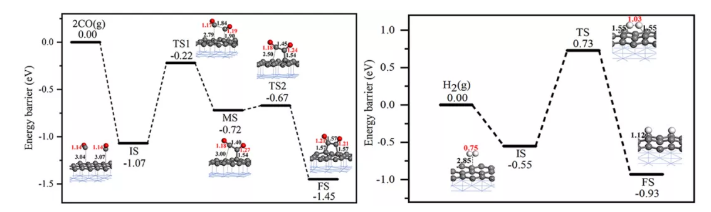 C-C偶联反应机理研究表明两个物理吸附于镍支撑石墨烯活性表面的气态CO可直接C-C偶联生成单C原子吸附的亚稳态O*CCO,随后进一步的形成双C原子吸附的O*C*CO。其中C-C偶联步具有最大的反应活化能垒0.85 eV,C-C偶联反应过程释放热量1.45 eV。