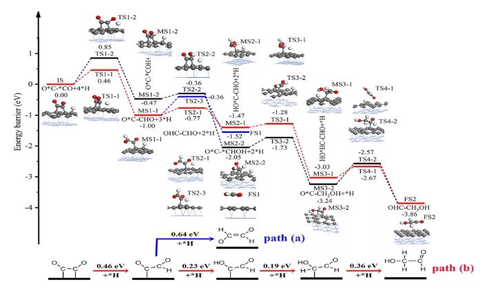 太阳成集团tyc王强和杨艳辉课题组系统研究了气态CO分子在镍支撑石墨烯活性表面上直接C-C偶联生成稳定化学吸附态的O*C*CO和O*C*CO加氢生成乙醇醛和乙二醛C2氧化产物的催化反应机理。