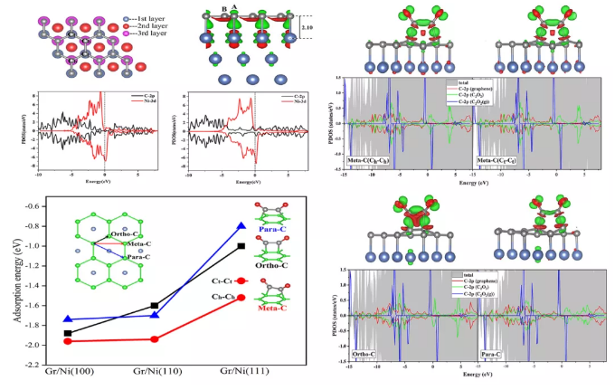 表面吸附研究表明O*C*CO在镍支撑石墨烯活性表面可形成邻位,间位和对位三种不同的稳定化学吸附构型。其中O*C*CO的两个C原子分别吸附于石墨烯六元环的邻位,间位和对位的两个C原子上,并形成强的化学键,而O*C*CO在镍支撑石墨烯活性表面间位吸附能最大。