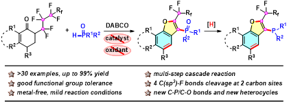 Abstract: Efficient synthesis of fluoroalkylated tri(hetero)arylphosphine oxides from perfluoroalkyl ketone and phosphine oxides or phosphonates has been achieved via successive C(sp3)-F bonds activation under mild reaction conditions. This approach involving new C(sp2)-P/C(sp2)-O bonds formation and fluoroalkylated heterocycle construction distinguish itself by its broad substrate scope and synthetic simplicity. Moreover, tri(hetero)arylphosphine could also be prepared in high yields by further reductive transformation.