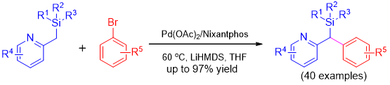 Abstract: The first palladium-catalyzed direct arylation of 2-pyridylmethyl silanes with aryl bromides to generate a diverse array of aryl(pyridyl)-methyl silane derivatives has been developed. This protocol facilitates access to various kinds of heterocycle-containing silanes in good to excellent yields (40 examples, 66−97% yield) with good functional group tolerance. The scalability of this transformation is demonstrated.