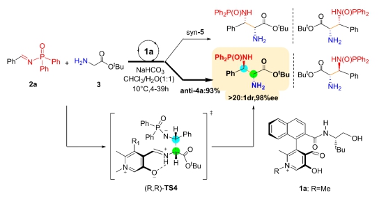 ABSTRACT: Density functional theory (DFT) calculations have been performed to gain insight into the catalytic mechanism of the N-quaternized pyridoxals (i.e., 1a) mediated biomimetic asymmetric Mannich reaction of tert-butyl glycinate 3 with N-diphenylphosphinyl imine 2a to give the diamino acid ester 4a in high yield with excellent enantiomeric and diastereomeric selectivity (Science 2018, 360, 1438). The study reveals that the whole catalysis can be characterized via three stages: (i) the catalyst 1a react with the tert-butyl glycinate 3 generate the active carbanion complex IM3. (ii) IM3 then reacts with the N-diphenylphosphinyl imine 2a giving the imine intermediate IM8. (iii) IM8 undergoes hydrolysis to give the final product anti-4a and regenerate the catalyst 1a for the next catalytic cycle. Each stage is kinetically and thermodynamically feasible for experimental realization. The hydrolysis step in the stage III is predicted to be the rate-determining step (RDS) during the whole catalytic cycle. Furthermore, the origins of the enantioselectivity and diastereoselectivity for the target reaction, as well as the deactivation of the catalyst 1b, are also discussed.