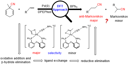 Abstract: Density functional theory (DFT) calculations have been performed to gain insight into the catalytic mechanism of the Palladium/Lewis acid-catalyzed transfer hydrocyanation of terminal alkenes to reach the linear alkyl nitrile with excellent anti-Markovnikov selectivity. The study reveals that the whole catalysis can be characterized via three stages: (i) oxidative addition generates the π-allyl complex IM2, followed by the β-hydride elimination leading to intermediate IM4. (ii) ligand exchange followed by Pd-H migratory alkene insertion gives the anti-Markovnikov intermediate IM6. (iii) IM6 undergoes reductive elimination step for the linear terminal nitrile 3a and regenerate the active species for the next catalytic cycle. Each stage is kinetically and thermodynamically feasible. The oxidative addition step, with a barrier of 30.9 kcal mol-1, should be the rate-determining step (RDS) in the whole catalysis, which agrees with the experimental high temperature of 110 oC. Furthermore, the origin of the high regioselectivity of the product with excellent anti-Markovnikov selectivity is discussed.