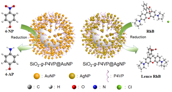 Hairy silica nanosphere supported metal nanoparticles for reductive degradation of dye pollutants
