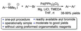 Abstract: An efficient palladium-catalyzed direct reductive cross-coupling of aryltrimethylammonium salts with aryl bromides was developed. The reactions proceeded smoothly in the presence of a palladium catalyst, magnesium turnings, LiCl, and TMEDA in THF at room temperature, leading to the corresponding biaryl compounds in moderate to good yields with reasonable functional group tolerance. The one-pot reaction using cheap and readily available aryl bromide as a coupling partner is simple to handle, thereby avoiding the use of pre-prepared organometallic reagents.