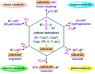 Abstract: As the “chemical chameleon”, sulfonyl-containing compounds and their variants have been merged with various types of reactions for the efficient construction of diverse molecular architectures by taking advantage of their incredible reactive flexibility. Currently, their involvement in radical transformations, in which the sulfonyl group typically acts as a leaving group via selective C–S, N–S, O–S, S–S, and Se–S bond cleavage/functionalization, has facilitated new bond formation strategies which are complementary to classical two-electron cross-couplings via organometallic or ionic intermediates. Considering the great influence and synthetic potential of these novel avenues, we summarize recent advances in this rapidly expanding area by discussing the reaction designs, substrate scopes, mechanistic studies, and their limitations, outlining the state-of-the-art processes involved in radical-mediated desulfonylation and related transformations. With a specific emphasis on their synthetic applications, we believe this review will be useful for medicinal and synthetic organic chemists who are interested in radical chemistry and radical-mediated desulfonylation in particular.