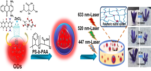 ABSTRACT: The photostability and dispersity under aggregation states always become an obstacle for the development of small-molecular organic dye (SMOD) composites. Herein, a novel supramolecular assembly strategy with a two-step assembly method is implemented to encapsulate SMODs for improving their photostability and acquiring uniformly dispersed nanoaggregates in aqueous solution. By the novel assembly strategy, photo-degradation rates of the anthraquinone-type dyes can decrease significantly, and the stability of dispersed nanoassembly bodies can be improved in solution. Based on the two-step supramolecular assembly strategy, a new kind of aqueous processing composite system can be developed for preparing multiband laser-responsive devices and in situ healing of optical composite films. This two-step supramolecular assembly strategy can provide a new template and reference for improving the defects of SMODs and fabricating high-performance optical devices.