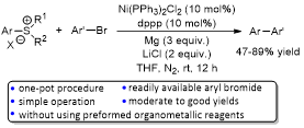 Abstract: The direct cross-couplings of aryl sulfonium salts with aryl halides could be achieved by using nickel as reaction catalyst. The reactions proceeded efficiently via C-S bond activation in the presence of magnesium turnings and lithium chloride in THF at ambient temperature to afford the corresponding biaryls in moderate to good yields, potentially serving as an attractive alternative to conventional cross-coupling reactions employing pre-prepared organometallic reagents.