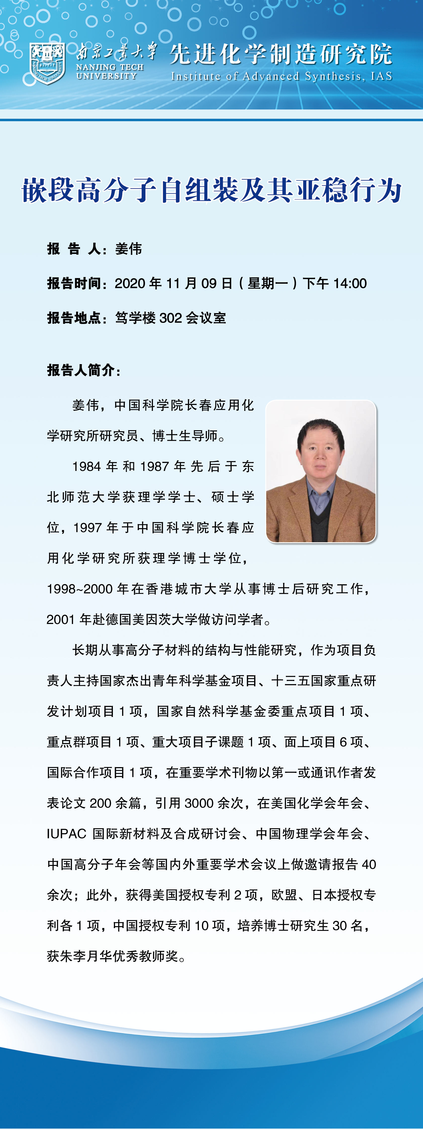 地址:南京浦口区浦珠南路30号 邮编:211880 电话:025-58139535、9536、9537 邮箱:chem@njtech.edu.cn