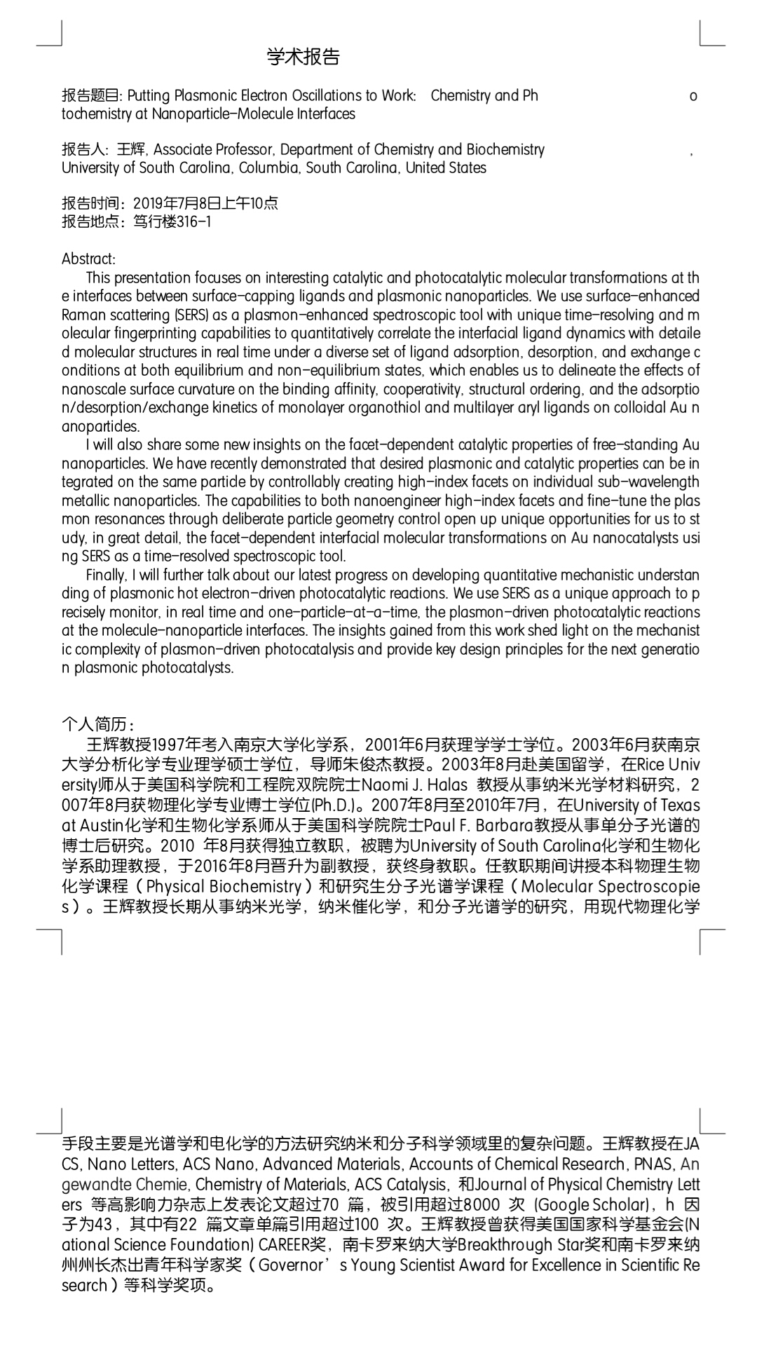 University of South Carolina, Columbia, South Carolina, United States王辉副教授学术报告会