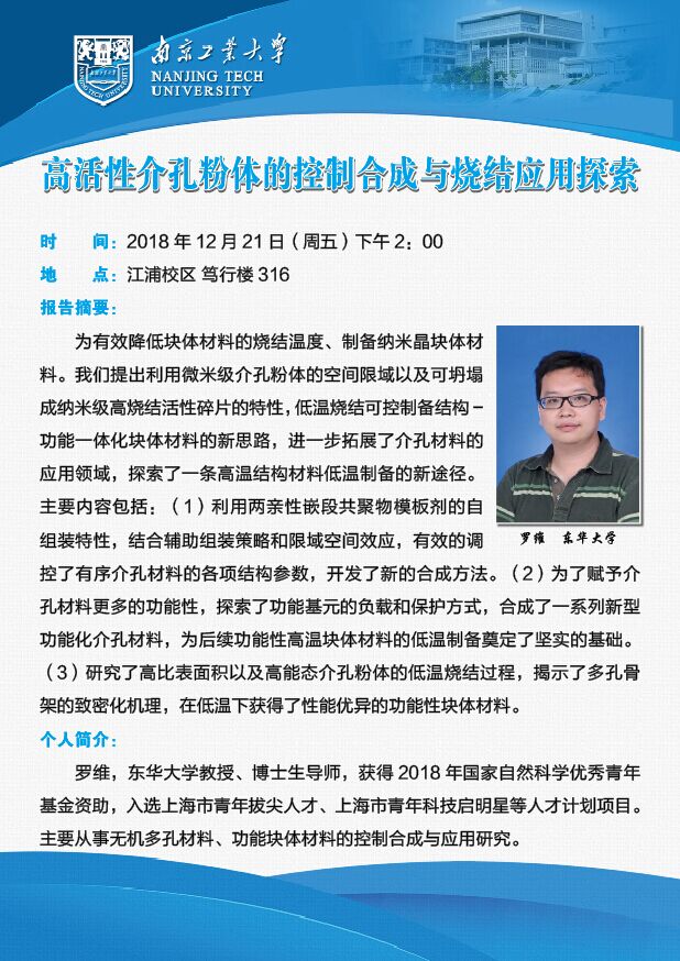 地址:南京浦口区浦珠南路30号 邮编:211880 电话:025-58139535、9536、9537 邮箱:chem@njtech.edu.cn