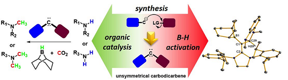 In describe the development of a synthetic protocol for the preparation of carbodicarbenes with unsymmetrical side arms and investigate their late transition metal complexes and intrinsic reactivities. The ligand carbodicarbene was used for possible catalysis application and main group chemistry.